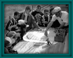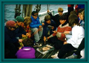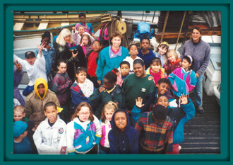 2,500 schoolchildren and 650 teachers were served with structured programs and more than 20,000 visitors were received at the ship. The 1995 sailing and teaching season began with a flourish as the Boston Public Schools hosted a very important first program of dockside and underway programs underwritten by a generous grant from the Boston Marine Society. Over 650 Boston Public school students (grades 3 - 12) and their teachers came aboard during May. The programs ranged from two hour dockside sessions to half-day sails out among the Harbor Islands. Co-sponsorship by the Department of Education and Department of Environmental Management provided for a series of meetings on the decks of the Ernestina in June bringing educators, teachers, institutions and agencies together through the Mass Bays Program and Massachusetts Bays Education Alliance. The ship sailed from Quincy at Bay Pointe Marina, Boston at the Charlestown Navy Yard and Gloucester at the Gloucester State Fish Pier for three hour sails designed to highlight local activities in education and action and to set the stage for connection, networking and coordination to enhance future activities. One of the most important efforts of the year involved the development of structure for the educational programs. The structure and content for the program came from the extensive background of the crew. Brief bios follow that give some hints of the variety of vessels also engaged in education at sea.