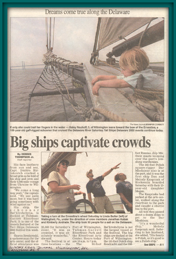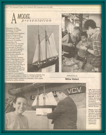 receives a model of Ernestina in thanks In 2000 Schooner Ernestina transited the Eastern Seaboard as part of the OpSail and TallShips events ranging from the northern Chesapeake to Halifax, Nova Scotia. An extensive overview is found in the Summer edition of the Log of a Record Run linked from the Outreach page.