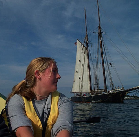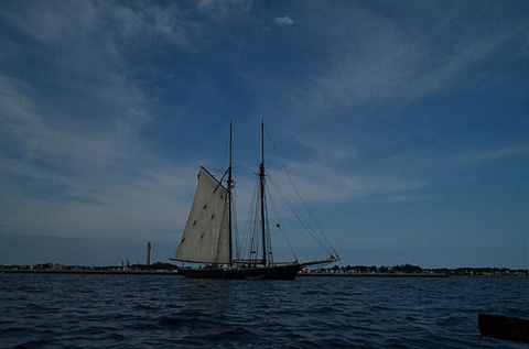 Ernestina at anchor with Pilgrim's Monument in