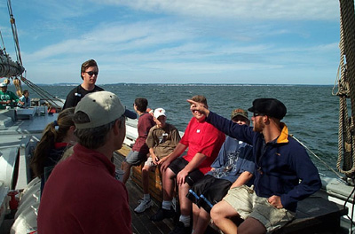 pirates board the Ernestina for a deck tour.