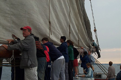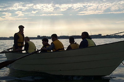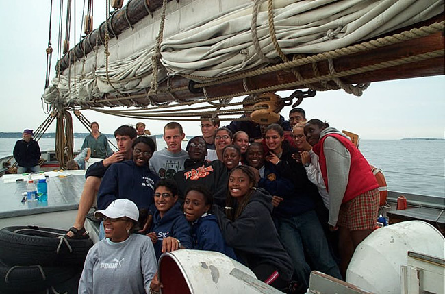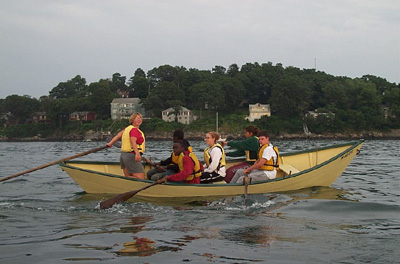 After morning chores, we got underway and set the main and the rest of the sails with everyone’s help.  Students again participated in discussions throughout the day with the ISACS staff, addressing issues of diversity and deciding the best method to convey what they’ve learned back to their own schools.  We had fair winds and calm seas and sailed throughout the afternoon, coming to anchor in Salem by 1700.  As soon as we let go the anchor, we hoisted the dories over the side and students used teamwork to row around the harbor.  After a yummy dinner, students took part in the evening program where the Ernestina crew joined them in talking about the diverse population we work with and challenges of living and working in a small environment