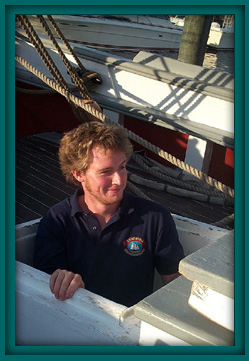 He has spent the last year (2003) on such sailing vessels as the HAWAIIAN CHIEFTAN and the LYNX in California, and Schooner ERNESTINA in New Bedford, MA  all while completing requirements towards a degree in the history of alchemy and serving on the Student Senate of Elders at Reed.  This boy is Adam Clark.