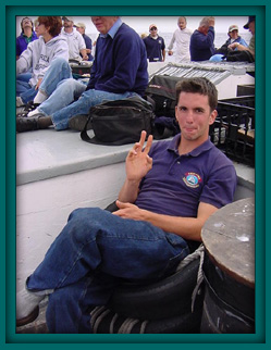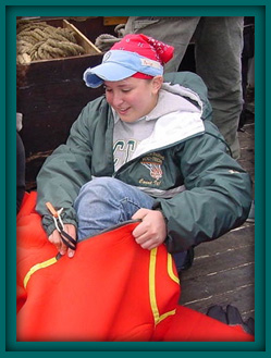 In the spring of 2002, Gwen joined the ERNESTINA, fitting into the line-up seamlessly during the up-rig and early part of the season.  Due to prior contract obligations, she returned to the CORWITH CRAMER for her curtain call as ship’s steward during the summer months.  Fortunately for team ERNESTINA, Gwen returned late in the season, for the Schooner’s Championship run.  Gwen will no doubt be a force to be reckoned with.  It has been said that she has “a natural ability with rope”, and one crewmember said, “She’s better than Stubbs”.