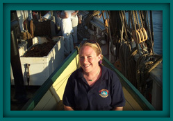 Rhonda J. Moniz joined the Schooner Ernestina in the 2003 season as an Onboard Program Coordinator.  Growing up in New Bedford, and having spent much of her career in the ocean as an open water scuba diving instructor and teaching marine awareness at local universities, Rhonda’s work onboard Ernestina seemed like a most natural fit.